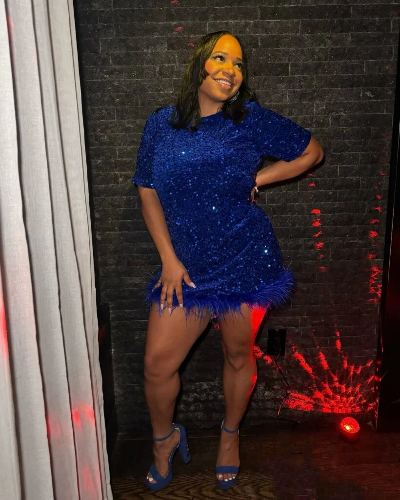 A feather-trimmed hem adds playful movement and that signature Studio 54 flair. Paired with matching blue heels, the monochrome look feels bold and cohesive. This outfit is the perfect mix of sparkle and sass, ideal for dancing the night away in true disco diva fashion.