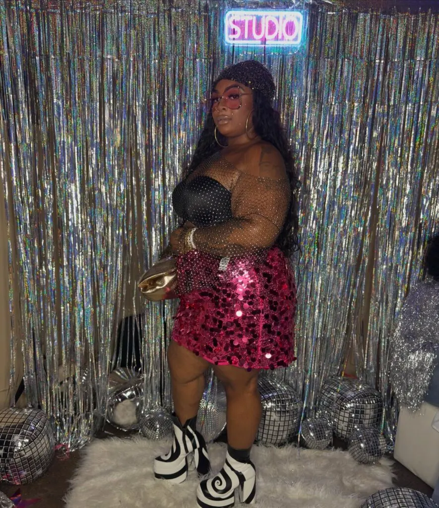 Each disc catches the light with dramatic shimmer, making this outfit perfect for the dance floor. Paired with black platform heels, the ensemble is edgy, glamorous, and unforgettable. It’s a daring take on disco fashion, built to steal the spotlight.