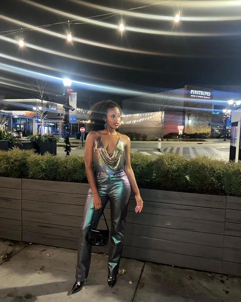 The plunging neckline and cinched waist create a flattering hourglass silhouette, while the flared legs add classic disco drama. Paired with gold platform heels and a camel coat draped over the shoulder, the outfit channels effortless glamour. It’s bold, dazzling, and made for turning heads under the city lights or disco ball.