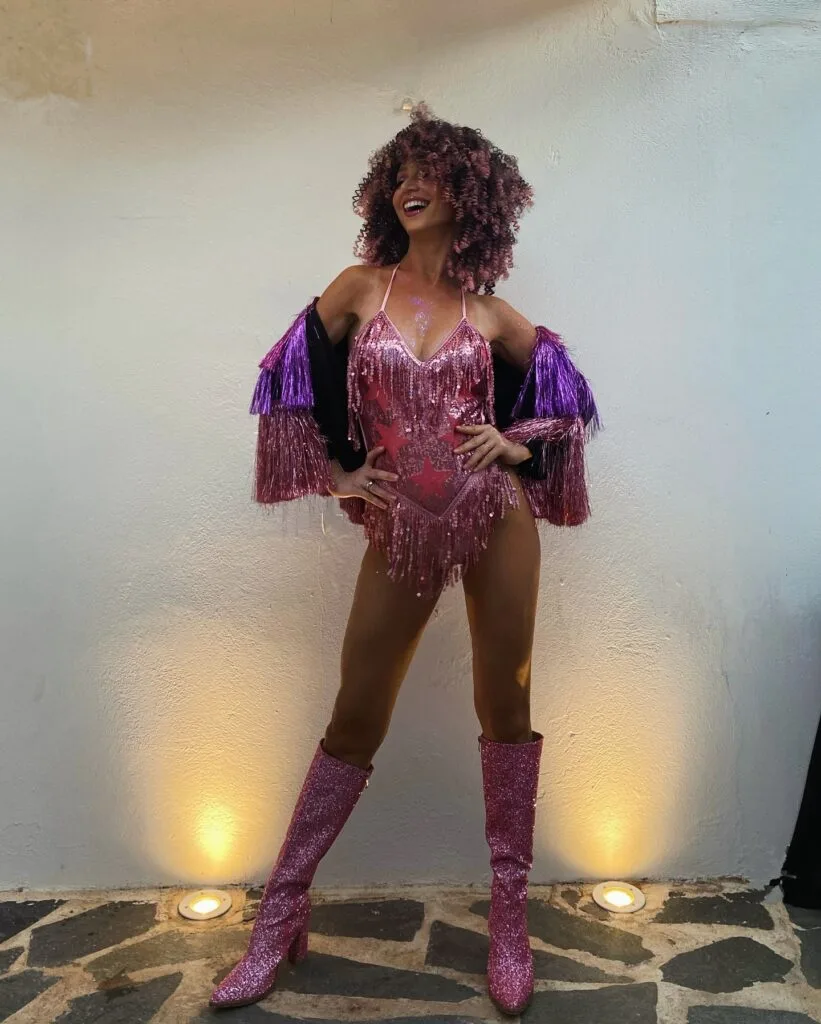 Paired with sparkling pink knee-high boots, the look is pure disco magic. Topped off with voluminous curls and a confident smile, this outfit is ready to own the dance floor. It’s bold, fun, and fabulously unforgettable.