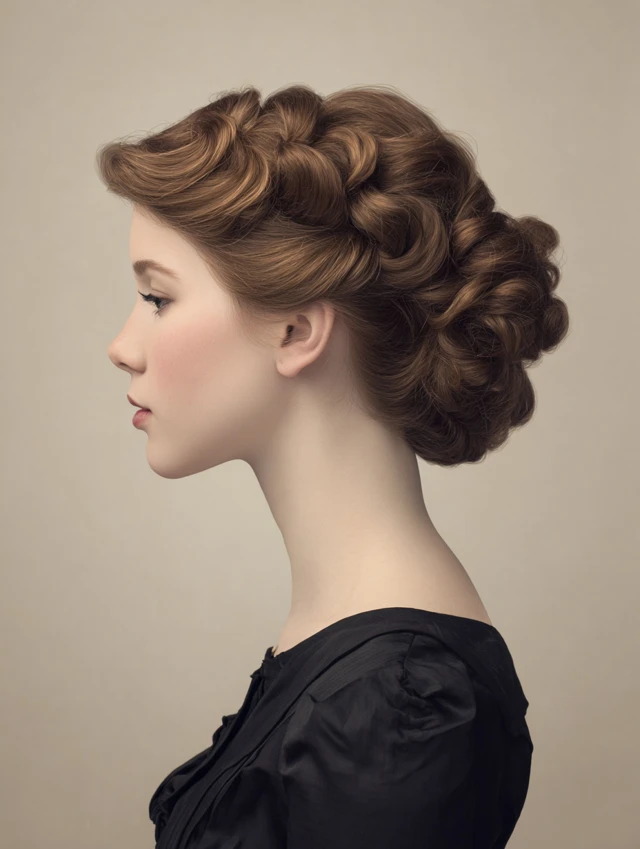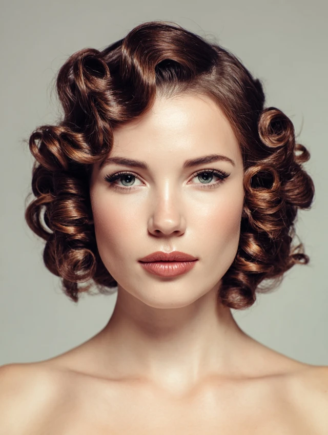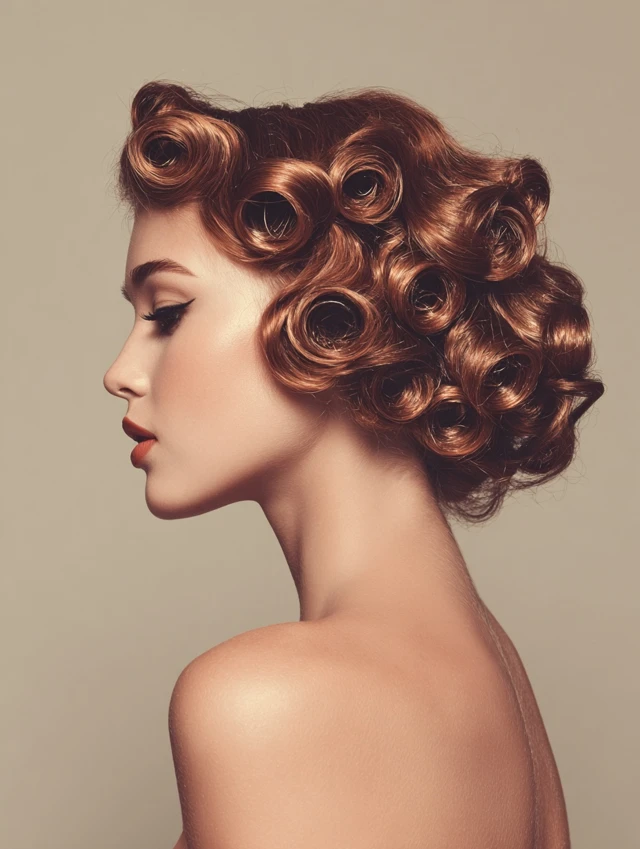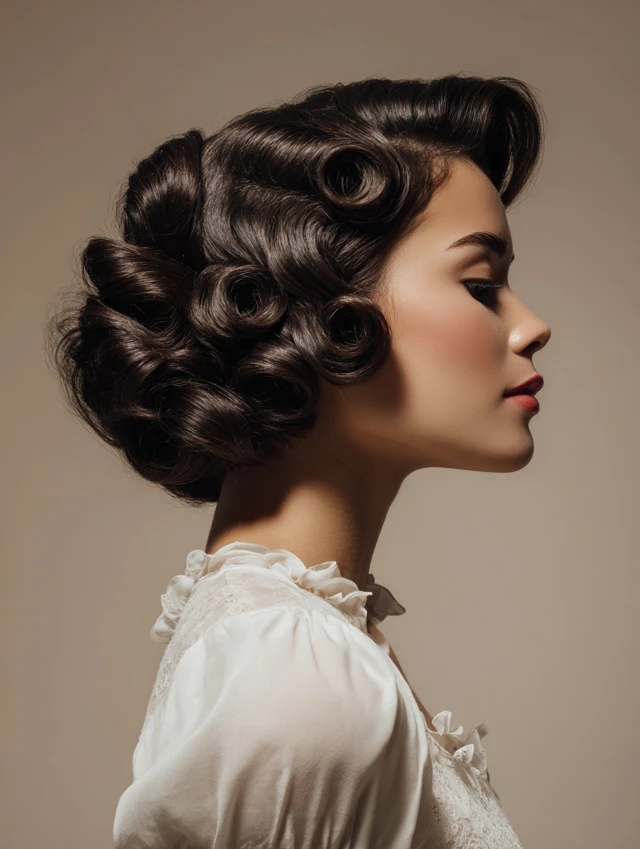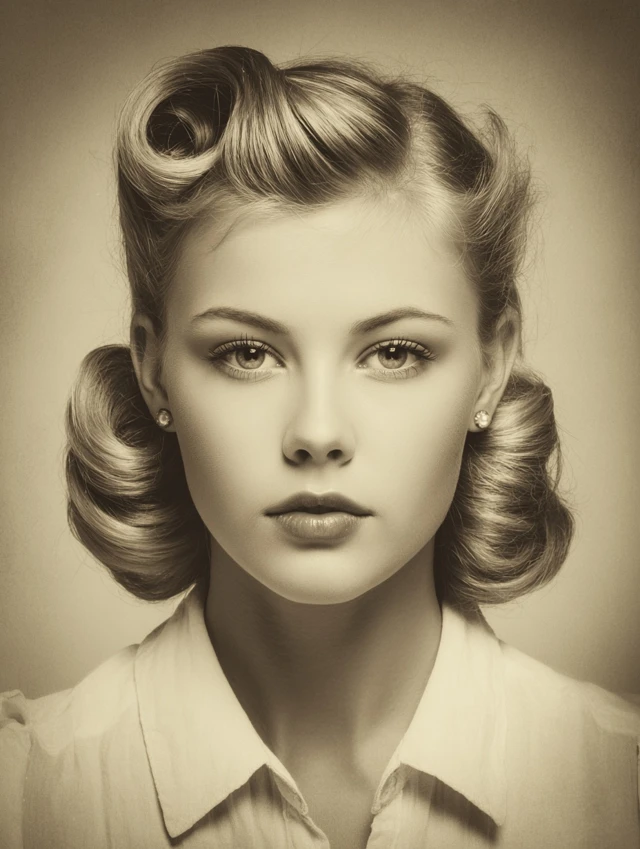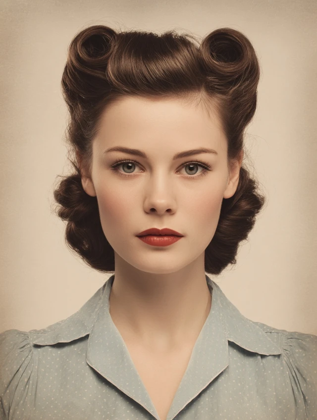 Victory rolls are classic 1940s hairstyles with rolled sections framing the face and crown. Works well for oval, round, and heart-shaped faces. Medium to thick hair holds rolls and volume beautifully.