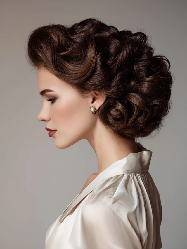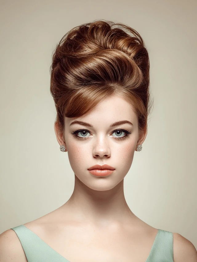 Bouffants feature voluminous crown hair with smooth sides, giving height and sophistication. Works for oval, round, and heart-shaped faces. Medium to thick hair provides natural lift and fullness.