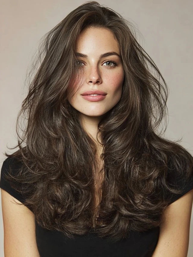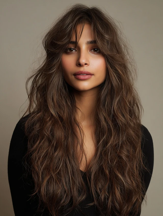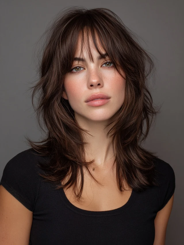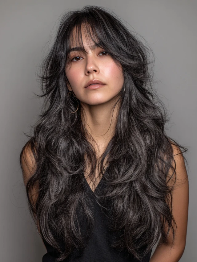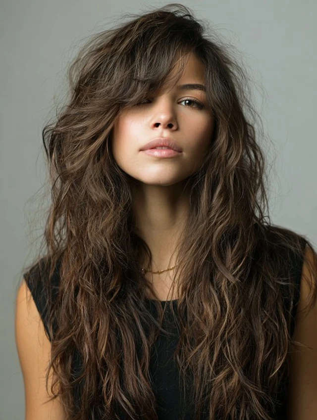The long wolf haircut for women keeps length while adding movement. The layered top prevents flatness. The longer ends soften the overall look. This style works well for thicker hair and wavy textures. It flatters round and heart face shapes by elongating the silhouette.